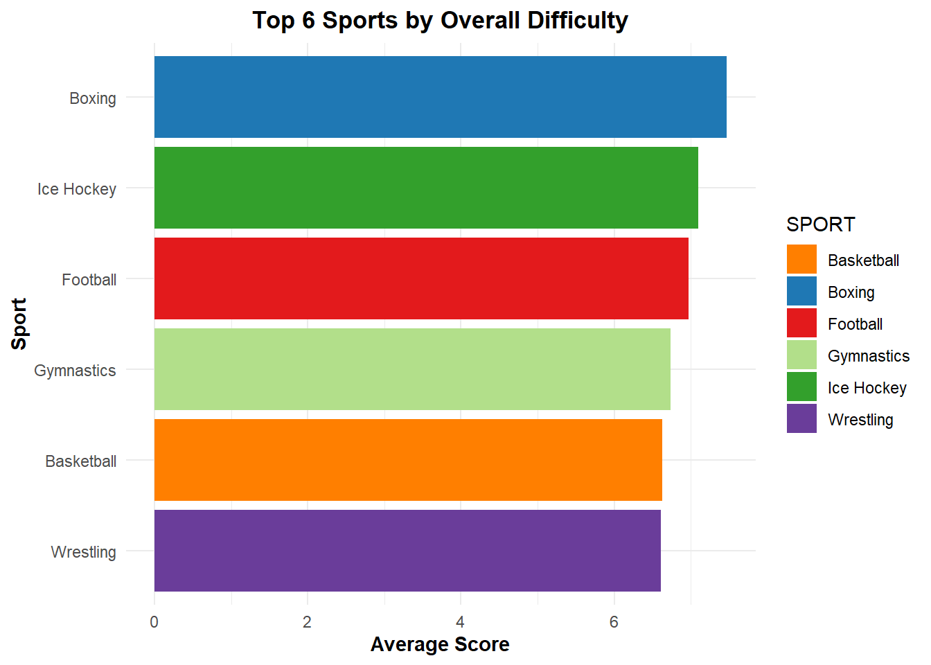 There is a surprising difference in the difficulty for the top 6 “hardest” sports. The data in this project/plot were pulled from an online database on Kaggle with the different requirements for different sectors of skills required for a variety of sports. To make the graph, we mapped the data to find the top six hardest sports in terms of difficulty. Comparing the top six hardest sports in the category of difficulty, we see that boxing is the hardest sport.